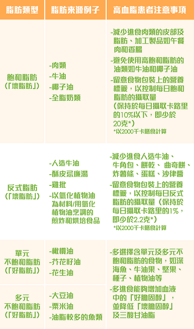 飲食是控制血脂的重要一環。高血脂患者大多懂得「多菜少肉」這個老生常談的做法,但其實攝取適量的「好」脂肪反而能更有效地減低高血脂。眾所周知,脂肪分別為飽和脂肪、反式脂肪、單元和多元不飽和脂肪,高血脂患者可因應這四大類,適當地攝取日常所需,對減低血脂水平反而大有裨益。
