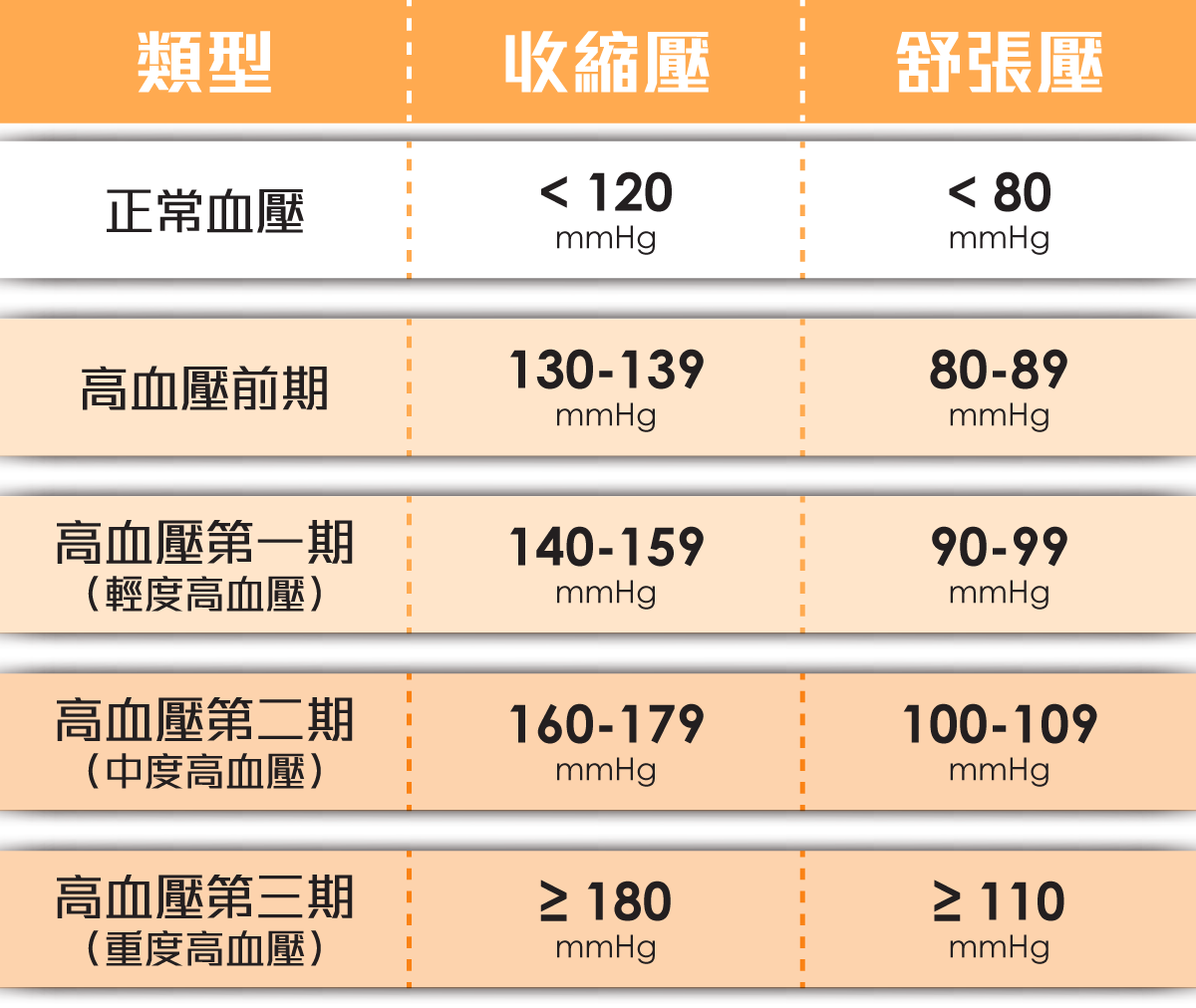 高血壓是指在動脈中的血壓持續高於正常水平的疾病。血壓是指心臟收縮時(收縮壓)和心臟舒張時(舒張壓)血液對動脈壁產生的壓力。醫學上,一般血壓會出現兩個數值,如120/80mmHg,首個數值稱作「收縮壓」,後者稱為「舒張壓」,收縮壓正常值界乎100-140 mmHg;舒張壓正常值為60-90 mmHg。西醫對於高血壓的血壓水平及病症分期,大概可歸類為以下類型: