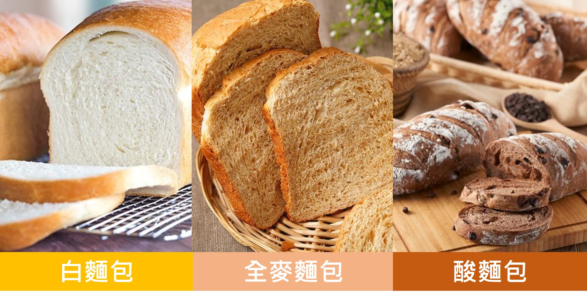 平常的白麵包用的是「小麥麵粉」,是經過多重加工後,用小麥的胚乳(Endosperm)製造出來的。全麥麵包(Whole wheat bread)用的是「全麥麵粉」。除了含有胚乳外,亦保留了麥麩(Bran)和胚芽(Germ),這些部份含有大量的膳食纖維、蛋白質、維他命、礦物質、良好的不飽和脂肪和抗氧化物,因此全麥麵包的營養價值比白麵包高。