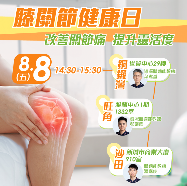 健康嗎聯手德善健康管理 舉辦「膝關節健康日」,由資深體適能教練為大家講解膝關節痛的成因、後果及處理方法,並會即場教導4式拉筋法及強化膝關節運動,有助增加肌腱及關節的柔軟度及活動幅度,提升活動能力,預防相關痛症。